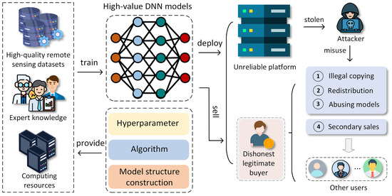 Unfortunately, as illustrated in Figure 1, during the deployment, distribution, and trade of models [16,17,18], model owners may be exposed to the threat of piracy due to unreliable platforms, dishonest legitimate buyers, and attackers. These malicious actors may redistribute, make secondary sales of, or steal models without authorization and may even tamper with them, repackaging them as their own services to commit IP infringement and extort the original model owners. Such actions pose a serious threat to the IP rights of RSOD model owners, causing significant losses and harm. Therefore, to protect the legitimate rights and interests of RSOD model developers, a comprehensive IP protection scheme for models must be developed that not only can detect piracy and prove ownership but also trace the sources of downstream pirated models—whether they originate from unreliable platforms or dishonest legitimate buyers.
