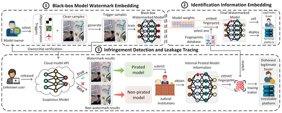 An overview of the proposed method is presented in Figure 2, comprising three main components: black-box model watermark embedding, identification information embedding, and infringement detection and leakage tracing. In the black-box model watermark embedding step, the watermark triggers representing the black-box watermark information are embedded into randomly selected samples. After training with these samples, the model learns the copyright watermark information. In the identification information embedding step, fingerprint information is embedded into the model weights before deployment or sale. During the infringement detection and leakage-tracing step, verification samples are first input into the API of the suspicious model, and infringement can be confirmed by verifying its output. Once infringement is confirmed for the model, the leakage source is identified by extracting fingerprint information from it. The details of the method are elaborated in the following sections.