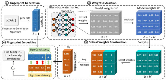 Specifically, we employ the SHA-256 hash function [39] with as input to generate a fixed-length binary output, denoted , where b represents the number of bits in the fingerprint information. To facilitate subsequent operations, we employ Equation (4) to convert into a vector composed of 1 and −1, representing positive and negative values: