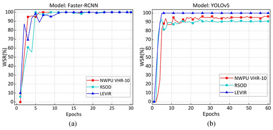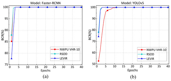 Model and Dataset Selection. In this study, we chose two classical RSOD models for experimental simulations: the two-stage Faster-RCNN with a ResNet50+FPN backbone [1] and the one-stage YOLOv5 model featuring a CSPDarknet53 backbone [4]. Additionally, three widely used RSOD datasets were utilized: NWPU VHR-10 [40], RSOD [41], and LEVIR [42].