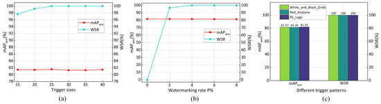 The impact of trigger size on and is illustrated in Figure 11a, which shows that with an increase in trigger size, slightly improves and eventually stabilizes at 100%. Furthermore, the trigger size has no significant impact on the . Consequently, we employ a trigger with dimensions of 25 × 25. This configuration enables the trigger to achieve = 100% during model ownership verification, surpassing the predefined threshold .