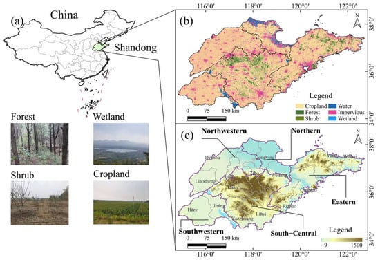 Study area. (a) Location of Shandong Province in China, (b) land use and cover change of Shandong Province, and (c) topographic map of Shandong Province, divided into five subregions. The vector data used in this figure were obtained from the Geospatial Data Cloud (http://www.gscloud.cn; accessed on 1 August 2024). The photos were taken during field surveys conducted in June 2024.