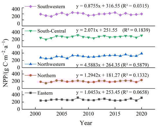 To uncover the temporal evolution characteristics of NPP in Shandong, linear regression analysis was conducted. The overall interannual (2001–2020) variation in NPP exhibited an upward trend, though the rate of increase is relatively modest in Figure 4. The trend line shows that NPP increased at a rate of 2.0916 g C·m⁻2/year, with an R2 value of 0.27, indicating that although the NPP showed an increasing trend over these 20 years, the rate was relatively slow. The annual average NPP remained mostly within the range of 250–350 g C·m⁻2/year during this period, with the lowest value observed in 2002 (224.82 g C·m⁻2/year), and a noticeable peak in 2020 (322.49 g C·m⁻2/year). The overall trend suggests that vegetation productivity in the Shandong region is showing a positive growth trajectory. For different regions within Shandong Province, the NPP trends from 2001 to 2020 exhibited significant variability (Figure 5). In the southwestern region, NPP remained relatively stable throughout the study period, with a slightly upward trend (slope of 0.8755). In contrast, the central−southern and northwestern regions showed more noticeable upward trends, with slopes of 2.071 and 4.5883, respectively, and relatively high R2 values, indicating an increase in vegetation productivity over the study period. The northern region also exhibited stable growth, with a slope of 1.2942 and an R2 value of 0.1332. In the eastern region, although NPP showed a slight increase (slope of 1.0453), the trend was not significant, with an R2 value of only 0.0658. Overall, except for the southwestern region, NPP in other areas of Shandong Province exhibited varying degrees of growth.