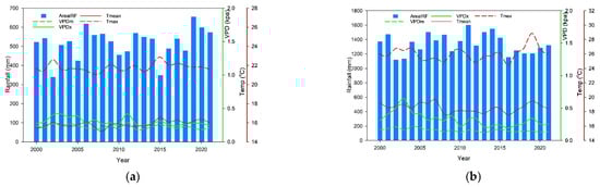 Historical (2000–2021) climate variables (seasonal areal rainfall, average temperature (Tmean), and vapor pressure deficit) of selected administrative zones: (a) Arsi from wheat growing area (June to October) and (b) Illu Ababora from maize growing area (May to September).