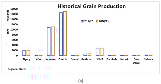 Historical grain yield: (a) total grain production in regional states, Ethiopia (2019/2020 and 2020/2021; (b) maize and wheat yield data at selected administrative zones in Oromia region (2000 to 2021), Ethiopia [15].