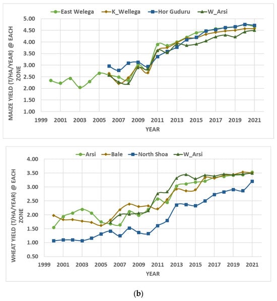 The crop yield data collected from the Central Statistics Agency of Ethiopia (CSA) for the years 2000 to 2021 provide a comprehensive overview of cereal yields at the zonal (district) administrative level (Figure 3). These data are crucial for model calibration as emphasized by Rijks et al. [34], who highlighted the importance of utilizing historical crop yield records to develop accurate quantitative yield estimates. The CSA employs standard statistical data collection and analysis methods to produce these estimates, which are reported annually. In this study, the Oromia region has been selected as representative study area, given its status as Ethiopia’s leading grain producing area, as indicated in the CSA’s reports. The data presented in Figure 3a illustrate the variations in crop yields over the specified period, reflecting trends and fluctuations that can inform agricultural practices and policy decisions in the region. By focusing on such a significant agricultural zone, this study aims to enhance understanding of yield dynamics and contribute to improved agricultural productivity strategies in Ethiopia.