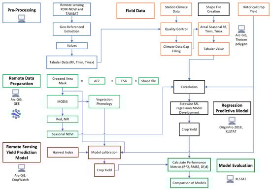 This study was undertaken following two principal analytical steps. First, Pearson’s correlation analysis was carried out to explore the associations among climate variables, NDVI, and crop yield. Next, a stepwise modeling approach was used, applying multiple regression models that include linear, non-linear, and polynomial modes, to determine their effectiveness in accurately predicting crop yield. The second approach involved using crop yield prediction model that was calibrated based on the crop phenology and harvest index for dominant maize and wheat growing areas of the study region. The general approaches followed in this research are depicted in Figure 4.