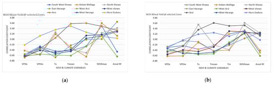 Climate variables and Normalized Difference Vegetation Index (NDVI) correlation analysis with (a) maize and (b) wheat yield at selected administrative zones in the study area.