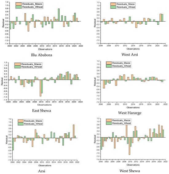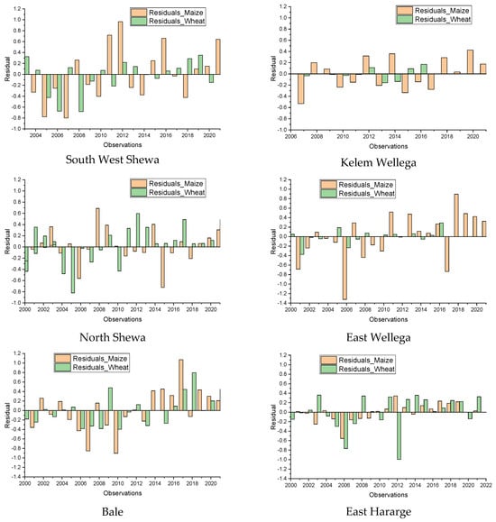 During the model selection process, we carefully analyzed residual patterns between observed and model-fitted crop yields to ensure no discernible trends were present, as such patterns could indicate potential model deficiencies. Figure 6 presents a residual plot for maize and wheat yields across all zonal administrations in the study area. This analysis was crucial in identifying the most effective predictor variables, typically ranging from four to seven per study area, based on the evaluation of the MSE, RMSE, and DF.