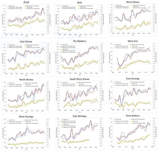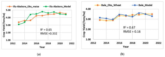 Yield predictions based solely on climate data were generated for the entire dataset, covering the years 2000 to 2021. As shown in Figure 7, these predictions occasionally overestimated or underestimated yields in specific years. Despite these deviations, the overall estimates closely matched the observed yields throughout the study period. The model demonstrated particularly higher accuracy in predicting maize and wheat yields in the Illu Ababora, Horo Guduru, and West Arsi zones. Additionally, it provides especially effective for wheat yield predictions across nearly all the study areas, as highlighted in Figure 7.