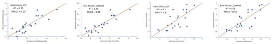 Additionally, this study demonstrated the effectiveness of the seasonal maximum NDVI in predicting yields for major crops such as maize and wheat in Ethiopia’s Oromia region. The monthly maximum NDVI captured variations in climate effects on crop yields, yielding low RMSE values and high R2 values, signifying strong predictive accuracy. In our study, the inclusion of the maximum NDVI (NDVIx) significantly enhanced model prediction accuracy as detailed in Table 1 and Figure 8 and Figure 9. For instance, incorporating the NDVIx into our models improved the R2 from 71% to 79% for maize and 73% to 83% for wheat in the Arsi zone. Similar improvements were observed in West Arsi zone, where the R2 increased from 82% to 89% for maize and 83% to 91% for wheat, highlighting the substantial benefits of including the NDVIx in yield predictions. We compared our results with studies that utilized NDVI data for yield prediction. Zinna and Suryabhagavan [23] found that the average NDVI was a significant predictor in their multiple linear regression model, suggesting that the average NDVI is a highly effective parameter for field-level yield predictions. Similarly, Rojas [46] developed a multiple linear regression using the NDVI to forecast maize yield in Kenya, explaining 87% of variations and achieving an RMSE value of 0.333 tons/ha.