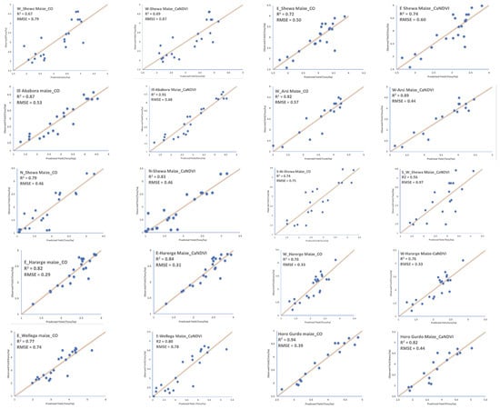 When comparing models that relied solely on climate data to those incorporating both climate data and the NDVI, significant performance improvements were observed. For instance, in the Arsi zone, the integration of the NDVI increased the R2 value for maize from 0.71 to 0.79 and for wheat from 0.73 to 0.83. Similarly, in the South West Shewa zone, models using only climate data achieved R2 values of 0.56 for maize and 0.58 for wheat. With the inclusion of the NDVI, these values rose to 0.74 for both crops. This marked improvement in predictive performance underscores the value of integrating the NDVI with climate data, as detailed further in Table 1.