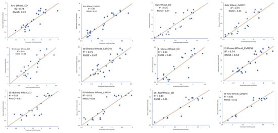 Scatter plots for predicted versus observed wheat yield, “CO = Climate only and CaNDVI = Climate-NDVI variables” across the study area.