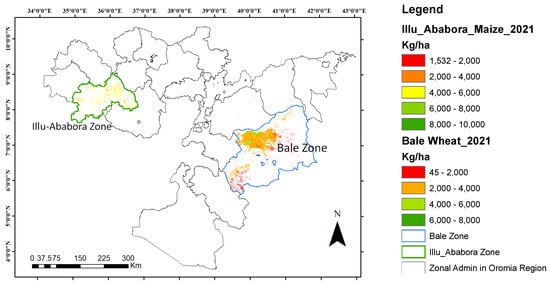 The spatial distribution of maize and wheat yields from 2013 to 2021 in two key cereal crop production zones of the Oromia region was estimated using the CropWatch crop yield prediction model. The model was specifically calibrated for wheat in the Bale zone and maize in the Illu Ababora zone. The results demonstrated a strong correlation between the recorded yields and model predictions, with an R2 value of 0.65 and an RMSE value of 0.332 tons/ha. For 2021, the maize yield prediction (Figure 10) showed that most yields per unit area ranged spatially between 4000 and 6000 kg/ha, with an average predicted yield of 4418 kg/ha. This closely aligned with the recorded yield of 4518 kg/ha, highlighting the model’s accuracy in capturing spatial yield variations.