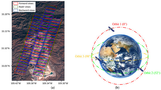 (a) Images of the forward, nadir, and backward views of the Morenci Mine test site in Arizona, USA, captured by the SkySat satellite [9]. (b) The different distributions of Dove satellite orbits with varying inclinations (0°, 52°, and 98°).