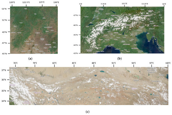 Visualization of practical scene tracking demonstration. (a) The Greater Khingan Mountains scene. (b) The Alps scene. (c) The Kunlun Mountains scene.
