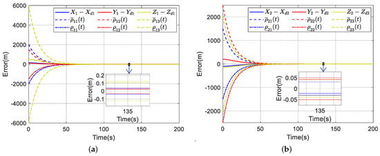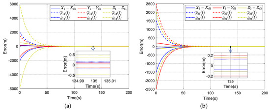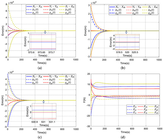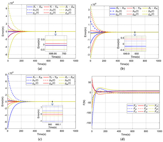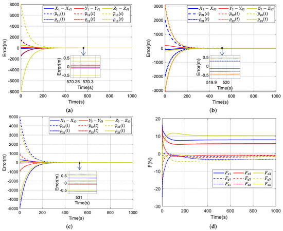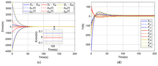 As shown in Figure 8a–c, the trajectory tracking errors of the LEO satellite relative to the desired path remain within the bounds defined by the performance function, specifically within the interval . Additionally, a magnified view at 135 s reveals that the tracking errors in all three mission scenes converge along all three axes within the range of [−0.1 m, 0.1 m]. In each mission scene, strict convergence times and error requirements were achieved across all axes. This demonstrates that the proposed control scheme’s ability to meet specified performance metrics is independent of the particular mission scenario. Regardless of the mission settings, the desired system performance can be ensured simply by adjusting the performance function, providing strong validation of the control scheme’s effectiveness. In Figure 8d, it is evident that the thrust required to complete the trajectory tracking tasks remains within a reasonable range. Initially, the thrust increases due to larger errors, but as the satellite approaches the desired performance, the thrust gradually stabilizes at a lower value, consistent with practical energy consumption expectations.