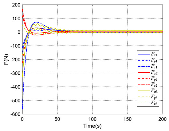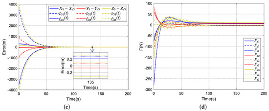 Figure 12 illustrates the tracking performance and the tracking error of the disturbance observer for the unknown disturbance components along the three axes of the ECI coordinate system in the three mission scenes. Specifically, Figure 12a–c present the tracking processes, while Figure 12d–f show the tracking errors. It can be observed that the disturbance observer exhibits satisfactory tracking performance across all performance requirements. The SkySat satellite operates at an altitude of 500 km, representing an LEO satellite. The primary disturbances it faces, including atmospheric drag and non-spherical gravitational effects, are already accounted for in the motion model. Other unknown disturbances, such as electromagnetic forces, collisions with space debris, and solar radiation pressure, have relatively small magnitudes, with some of these effects exhibiting finite energy characteristics. Therefore, assumptions about the initial values of these disturbances and simulations of their varying characteristics are sufficient. Although these disturbances are small, over time they can cause orbital deviations and have a significant impact when high-precision control is required. The results shown in the figure confirm that the designed disturbance observer effectively mitigates the impact of unknown disturbances, preventing control failure under high-precision performance function constraints. As a result, remains confined within a very small range, allowing the control input to satisfy Equation (31) with a minimal compensation term, thus avoiding excessive control energy consumption.