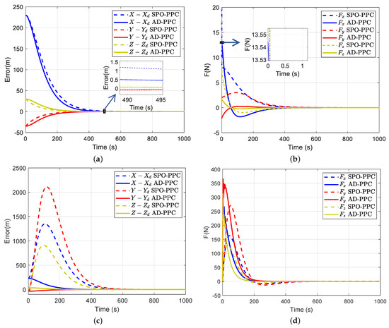 The comparison results are shown in Figure 13, where Figure 13a illustrates the trajectory tracking error along the three axes in the ECI coordinate system, and Figure 13b shows the corresponding control inputs. From the magnified portions of the figures, it is evident that the proposed method achieves faster convergence and lower energy consumption. As shown in Figure 13c, when encountering strong unknown disturbances, the LEO satellite under the SPO-PPC control scheme loses robustness, deviating significantly from the intended path and only completing the convergence action after the unknown disturbance has attenuated. In contrast, the AD-PPC control scheme responds promptly by enhancing thrust along all three axes to compensate for the sudden disturbance, as shown in Figure 13d, maintaining system robustness without affecting the convergence process. This fully demonstrates the advantages of the disturbance observer integrated into the AD-PPC scheme.