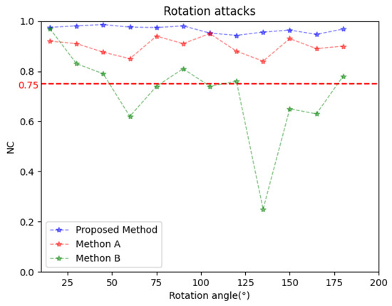 Conversely, while Method A possesses the capability to withstand arbitrary rotational angles, the NC values across all 12 experimental datasets are inferior to the lowest NC value of this method, which is 0.94. Consequently, this method outperforms Method A in both accuracy and detection stability. Method B exhibits significant variations in NC values across multiple rotational attack angles. The method’s NC value is already below the threshold of 0.75 at rotation angles of 60°, 105°, and 120° to 165°, with a minimum NC value of 0.25 at a rotation angle of 135°. The experimental findings indicate that Method B exhibits inadequate resilience to rotating attacks.