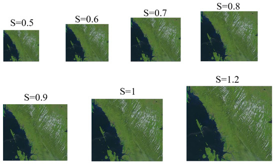 Scaling attacks encompass image interpolation and image resampling. This section establishes a scaling factor S to assess the method’s resilience against scaling attacks. An A × B pixel image transforms into an (A × S) × (B × S) image under the scaling factor, indicating that the image is either reduced or enlarged by a factor of S in both horizontal and vertical dimensions. Figure 13 and Table 3 illustrate that the value of S is increased by 0.1 at intervals ranging from 0.5 to 1. An additional S = 1.2 is incorporated to validate the extraction results of the watermark post-interpolation, using an image of 7891 × 6941 pixels as an example to illustrate the dimensions following the scaling attack.