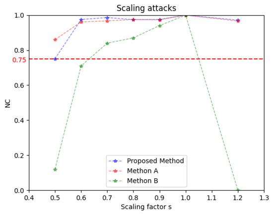 This method and Method A exhibit similar resistance to scaling attacks and outperform Method B under such conditions, routinely achieving NC values exceeding 0.75, indicating superior robustness.