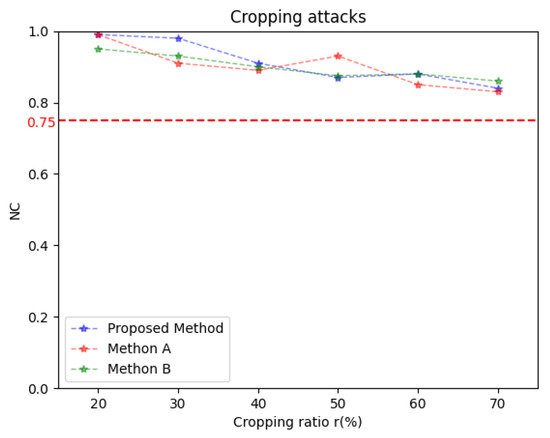 Figure 16 illustrates the experimental outcomes of the current technique subjected to various intensities of cropping attacks. The graphic illustrates that the current approach, along with Method A and Method B, exhibits comparable resistance to cropping attacks. The NC values of the three methods exhibit a consistent decline when subjected to cropping ratios ranging from 20% to 70%; however, they consistently remain above 0.83. This suggests that even if a significant portion of the image is cropped, the watermark information, which is strongly correlated with the original watermark, can still be retrieved. In this experiment, Method A exhibits greater fluctuation than both this method and Method B, resulting in slightly inferior stability. However, the NC value of this method is marginally higher than that of Method B in most instances, and its performance is nearly equivalent to that of Method B at cropping ratios of 40%, 50%, and 60%.