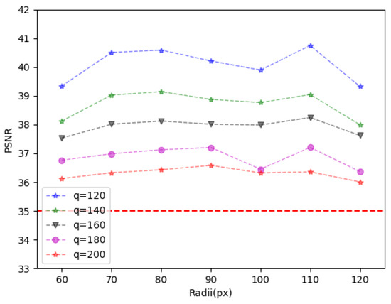 To examine the influence of watermark embedding strength on PSNR, we varied the embedding strength in 20 intervals between 120 and 200, and the watermark radius in 10 intervals between 60 and 120, while maintaining the number of watermark bits set to “1” at 18. Figure 19 illustrates the impact of watermark embedding strength on PSNR values across different watermark radii. Figure 19 also illustrates the impact of watermark embedding strength on PSNR values across various watermark radii, while indicating that an increase in watermark embedding strength correlates with a decrease in PSNR value, hence diminishing the watermark’s imperceptibility. At a watermark strength of 200, the PSNR value remains approximately 36. This publication advises that the embedding strength of the watermark information should not exceed 200 to maintain the algorithm’s imperceptibility.