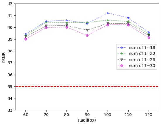 To examine the impact of the quantity of watermark information bits “1” on PSNR, we established the number of embedded “1” information bits at intervals of 4 within the range of 18 to 30, the watermark radius at intervals of 10 within the range of 60 to 120, and the watermark intensity at 120. Figure 20 illustrates the impact of the quantity of watermark embedding bits “1” on the PSNR value across various watermark radii, indicating that the influence of the number of information bits “1” on the PSNR value is less significant than that of embedding intensity. The influence of embedding strength on PSNR is less significant than the impact of embedding strength. In the ring watermark containing 40 bits of information, an increased quantity of “1”s correlates with a diminished PSNR value, although the overall PSNR remains within the range of 38 to 41. Consequently, the quantity of information bits designated as “1” can be determined based on practical application requirements. To ensure the precision of semantic segmentation and elliptical fitting, this study recommends that the count of “1” exceed 10.