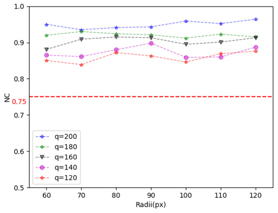 To examine the influence of watermark embedding strength on the NC value, we varied the embedding strength in 20 intervals between 120 and 200, and the watermark radius in 10 intervals between 60 and 120, while maintaining the number of information bits “1” at a constant 18. Figure 21 illustrates the impact of watermark embedding strength on the NC value across different watermark radii. The radius of the watermark exerts minimal influence on the NC value; however, the strength of the watermark embedding significantly affects the NC value. Increased intensity correlates with an elevated NC value. This outcome indicates that increased watermark intensity correlates with enhanced accuracy in semantic segmentation and elliptical fitting, leading to more precise localization of watermarked information bits, while mitigating the influence of image noise on extraction results.