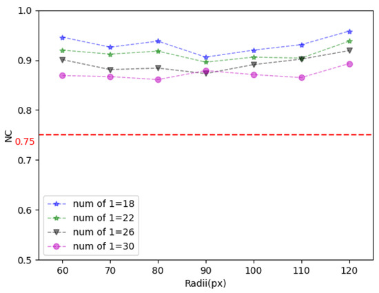 To examine the impact of the quantity of watermark information bits “1” on NC, we established the number of embedded watermark bits “1” at intervals of 4 within the range of 18 to 30, maintained the watermark radius at intervals of 10 between 60 and 120, and fixed the watermark intensity at 120. Figure 22 illustrates the impact of the quantity of embedded watermark bits “1” on the NC value over various watermark radii. The correlation is evident: an increased quantity of watermark bits designated as “1” corresponds to a greater NC value, hence enhancing the integrity of watermark extraction. This outcome indicates that the watermark information bit “1” significantly influences the precision of semantic segmentation and ellipse fitting; an increased frequency of “1” corresponds to a greater number of bright spots in the image spectrum, facilitating the differentiation of the watermark information from the background, thereby enhancing segmentation and fitting accuracy. A greater quantity of “1”s correlates with an increased number of bright spots in the image spectral map, facilitating the segmentation of watermark information bits from the background, hence enhancing the accuracy of segmentation and fitting.
