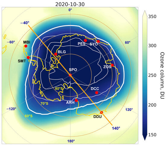 The ground-based stations included in the present study are identified by their GAW ID (see Table 1). The background represents the ozone column distribution constructed from the ERA5 dataset for the day indicated on the map. The thick white curve outlines the ozone hole edges (the area with an ozone column lower than 220 DU), while the thin white curves present the areas with an ozone column less than 180, 150, and 140 DU from the edge to the inner regions, respectively. The orange line determined by −40° and 140° meridians approximately depicts the strip covered by most stations.