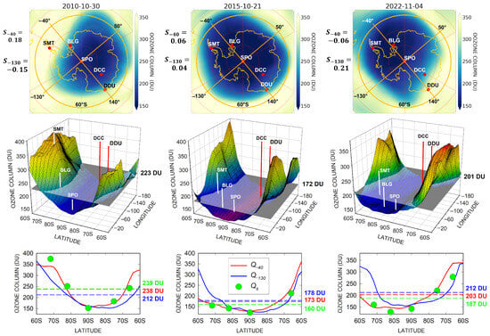 Examples of the distribution of ozone columns in zone , defined as the area between 60°S and 90°S for the three days given by the columns. The upper panel in each column exhibits a map constructed from the ERA5 dataset, where the 60°S circle together with the and lines are also given. The second panel shows a 3D plot of the ozone in . The grey surface represents the level of the zonal average ozone and its amount is given on the right vertical axis. Five of the stations adopted in Section 2 are indicated through their GAW ID (see Table 1). The lower panel in each of the columns shows the latitudinal ozone patterns and in two sections of the corresponding 3D plot determined by (red curve) and (blue curve), respectively. In addition, the daily ozone amounts at the selected stations are also given by the green circles and ordered according to the station positions presented in the upper two panels. The average ozone amounts and calculated for the two curves and circles are indicated by the dashed lines, and the values are given on the right axis in the corresponding colors.