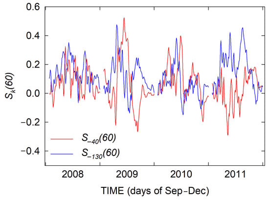 Time patterns of and defined by Equation (7) and calculated for a 4-year period. The time for each year covers only the September–December period.
