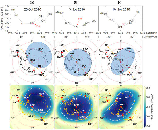 Bearing in mind the above considerations, Figure 13 shows an example of a hole reconstruction for three days in 2010, for which data are provided for eight stations. The first row in Figure 13 shows the ozone columns at the stations projected on similarly to the lowest panels in Figure 3. Since SYO is far from , the values at this station in the upper row in Figure 13 are schematically presented with respect to SPO, depending on the SYO ozone column. The upper panels in Figure 13b,c show that the ozone minima were measured at SPO, which gives an idea about the hole center. In the case presented in column (b), it can be noted that BLG, SPO, ARH, DCC, and DDU are in the zone with DU. On the other hand, SYO and DDU, which are almost equally far from the central SPO station with about 100° angular elongations to each other, show quite similar ozone amounts close to 220 DU. This means these stations should be on the hole edges. The ozone column at MBI and SMT is relatively high, and since at BLG it is low, it can be concluded that the edge of the ozone hole should pass between BLG and SMT. These features show a circle-like shape in the ozone hole, centered at SPO in the middle panel of Figure 13b, indicated by the blue zone.