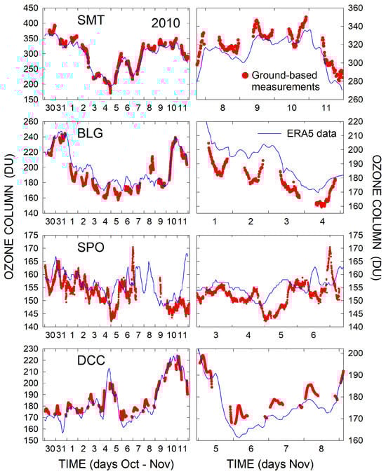 All the above considerations concern the daily mean ozone columns. In fact, the ground-based measurements are able to represent short-time ozone variations within an hourly timescale that could describe the diurnal fluctuations of the ozone hole shape [60,61,62]. Figure 14 represents some examples of the ozone variations registered at four stations where measurements with high frequencies are available. The results are given in Figure 14 by red circles. It should be noted that the measurements at DCC and SPO were carried out with a nearly five-minute frequency, while at BLG and SMT, the time step was about 9 and 12 min, respectively. The hourly data taken from the ERA5 database are also shown in Figure 14 for comparison. Despite the general consistency between the two groups of time series in the left column of Figure 14, the ground-based measurements reveal stronger short-period dynamics in the ozone column presented by variations in DU. This occurrence is better seen in the right column of Figure 14, which shows the higher amplitude of the ozone variations found from the ground-based observations than those presented by ERA5 data. For instance, the variations in the period 1–2 November at BLG are almost twice as intensive as those represented by ERA5. A similar occurrence can be noted between 9 and 10 November at SMT and between 6 and 7 November at SPO. The latter case, presenting variations in more than 20 DU in the ozone column within a few hours, is consistent with the variations reported in [62].