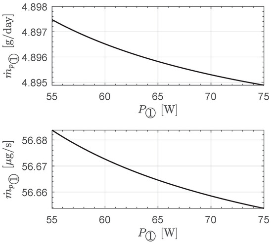 The expression of the total propellant mass flow rate as a function of P is similar to that written in the previous equation. In particular, recalling that the propellant mass flow rate of a single engine unit is assumed to be constant (with ) and equal to given by Equation (6), one has