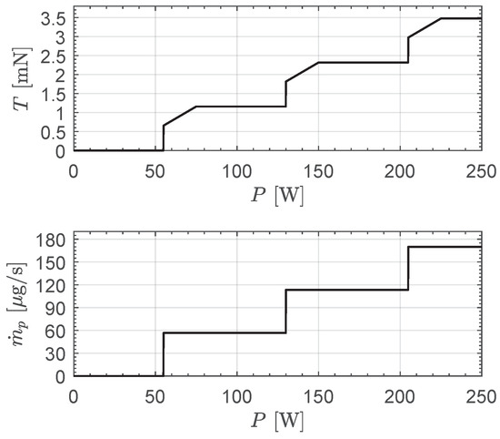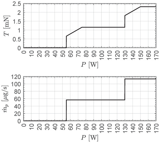 The limit case of refers to an interplanetary CubeSat with a single electric thruster, as in the case of the NASA’s Lunar IceCube and LunaH-Map [50]. Bearing in mind the admissible range of the power-processing unit input power described in the previous section, when the electric thruster is switched on, the expression of the total thrust magnitude as a function of P is given by