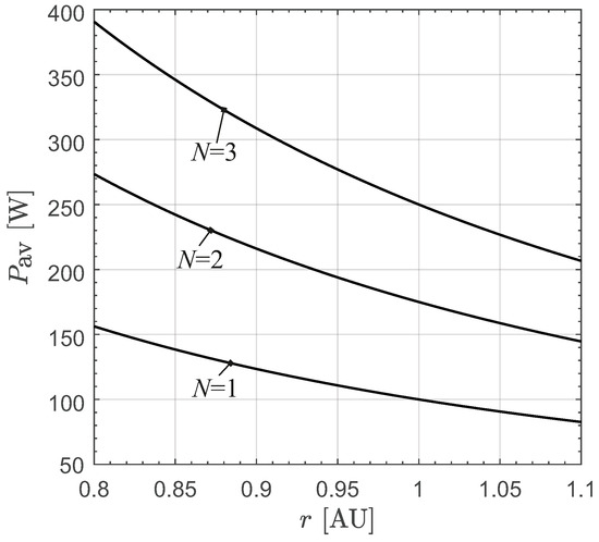 Finally, the variation in the available electric power as a function of the distance from the Sun, i.e., the output value of the power generation subsystem as a function of the Sun–CubeSat distance r, was modeled using a simple -type relationship. In this regard, bearing in mind that the design value of the required electric power is given by the sum , one has
