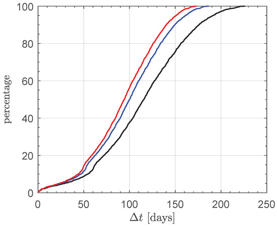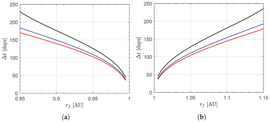 In any case, it is useful to remember that the trajectories discussed in this work are optimal from the point of view of flight time, and not from the point of view of propellant consumption. In other words, it is certainly possible to obtain transfer trajectories that require a lower propellant consumption than that indicated in Figure 10, obviously at the expense of a greater flight time. In this sense, the analysis of minimum-time trajectories is the first step for a more refined study of the transfer problem [71] which, at a subsequent step, requires also the inclusion of the ephemeris constraints.