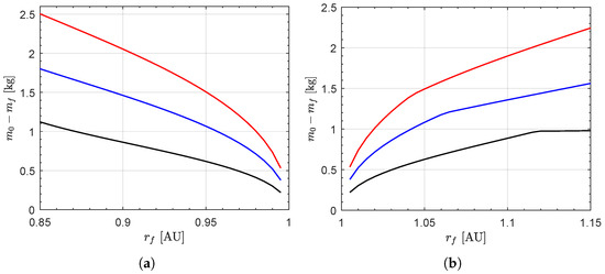 The optimization method and the numerical procedure illustrated above were employed to obtain the rapid transfer trajectory as a function of the number N of (sequentially activated) miniaturized electric thrusters in the array, and the target value of the solar distance to be reached by the interplanetary CubeSat, where is the final time instant which is one of the scalar outputs of the procedure. In this context, the CubeSat’s inertial velocity at the end of the flight is left free, as the spacecraft azimuthal angle and the vehicle’s total mass. In particular, at the end of the trajectory optimization the final mass of the CubeSat is compared with its minimum admissible value given by the difference , where the two terms are detailed in Table 1, in order to verify whether the obtained solution is consistent with the CubeSat mass distribution model. In fact, recall that is the total mass of the propellant stored on board the spacecraft.