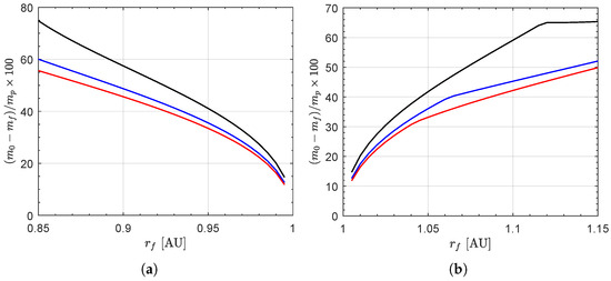 For example, consider the case of . In this scenario, Figure 9b gives a minimum flight time of about when , while one has a flight time of (i.e., ) if , and a flight time of (i.e., ) if . In the same scenario, Figure 10b gives a propellant expenditure of when , while the required propellant is if (i.e., with respect to the case of a single engine unit), and if (i.e., ). However, if compared with the total propellant mass stored on board the spacecraft, the required mass of propellant is about of if , or if , or if ; see the graphs sketched in Figure 11b.