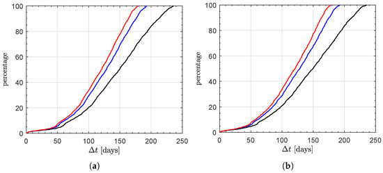 Minimum flight time as a function of N and the final (target) distance . Black line →; blue line →; red line →. (a) Case of ; (b) case of .