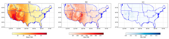 Spatial distribution of FWI metrics across the CONUS (2014–2023), showing mean (a), maximum (b), and minimum (c) FWI values, highlighting regional variability and hotspots of fire weather conditions. The blue lines are representing the climatic regions.