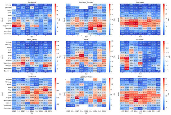 Seasonal variability in the FWI provides critical insights into the temporal distribution of wildfire risk across the nine climatic regions of the CONUS. The monthly averaged FWIs from 2014 to 2023 revealed clear seasonal trends, highlighting both regional patterns and inter-annual fluctuations. This section analyzed these seasonal variations using heat maps and spatial distribution maps.