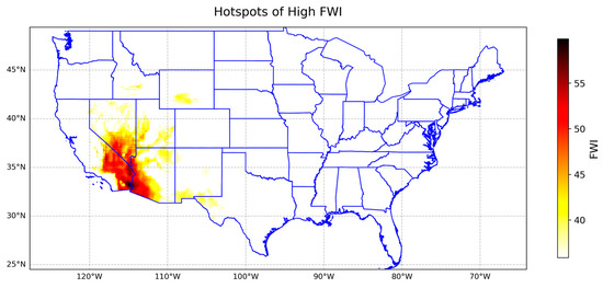 Spatial distribution of FWI hotspots across the CONUS. The blue lines are representing the states of CONUS.