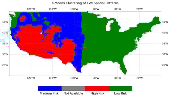 K-means clustering of FWI spatial patterns across the CONUS, highlighting three distinct risk levels: high risk (red), medium risk (blue), and low risk (green).