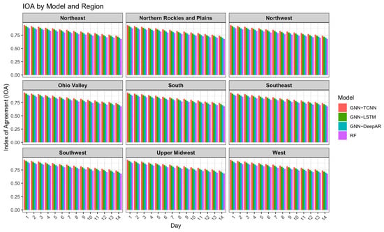 The performance of the four models, GNN-TCNN, GNN-LSTM, GNN-DeepAR, and RF, for wildfire forecasting was evaluated across nine regions of the CONUS. The GNN-TCNN model consistently outperformed the other models, achieving the highest IOA values and the lowest RMSE across all regions and forecast days. For instance, in the Northeast region, the GNN-TCNN achieved an IOA of 0.94 and an RMSE of 1.20 on Day 1, which gradually declined to an IOA of 0.74 and an RMSE of 3.50 by Day 14. In contrast, the GNN-LSTM, GNN-DeepAR, and RF exhibited slightly lower IOA values, with RF consistently showing the poorest performance. This trend was consistent across all regions.