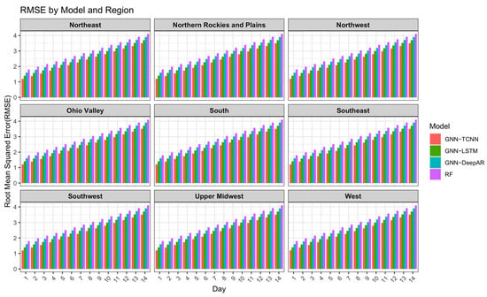 Comparison of model performance in terms of RMSE for the GNN-TCNN, GNN-LSTM, GNN-DeepAR, and RF over a 14-day forecast horizon.