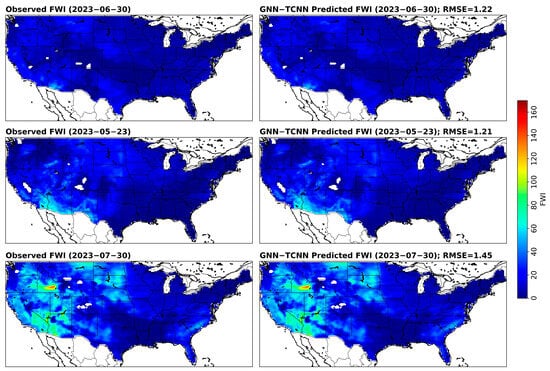 Comparison of observed FWI with the GNN-TCNN-predicted FWI for the best results during the testing period across the CONUS.